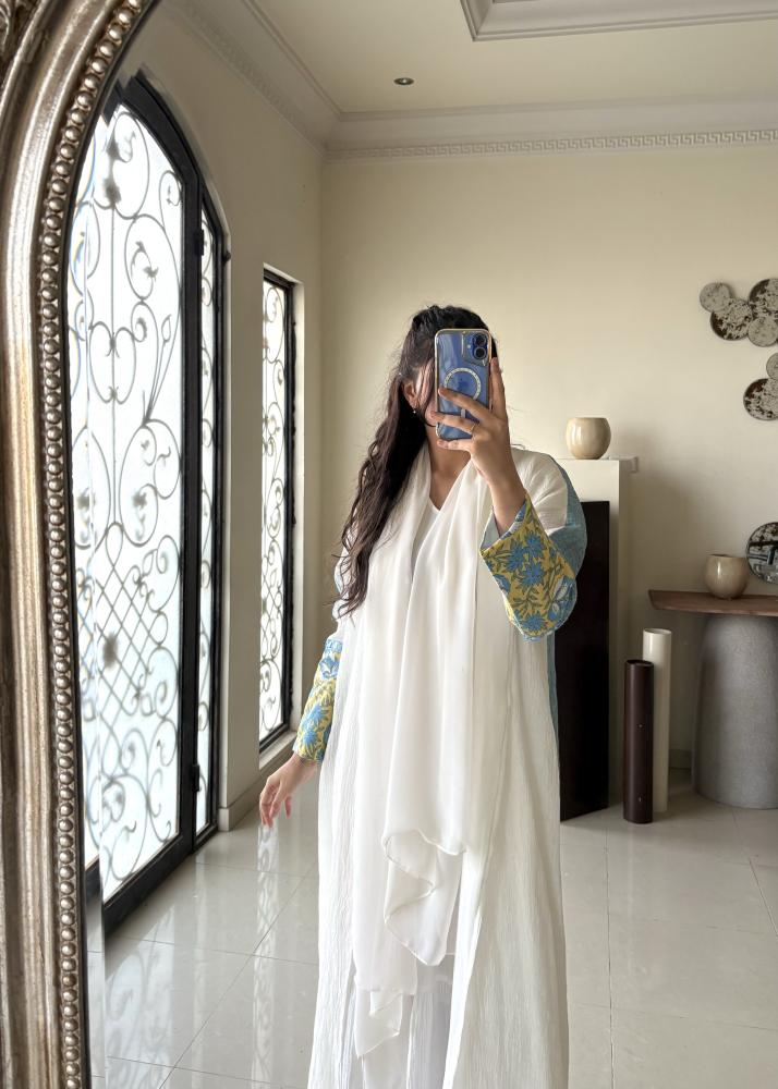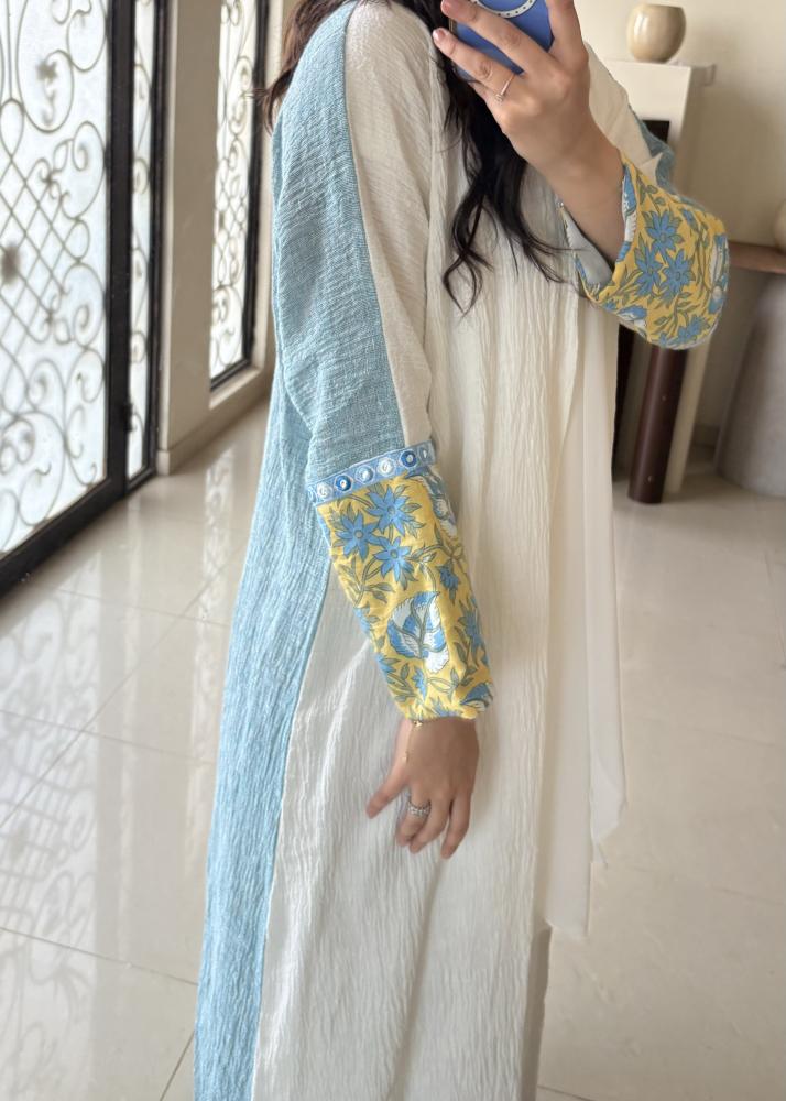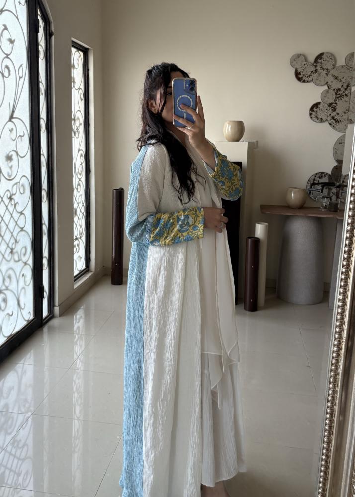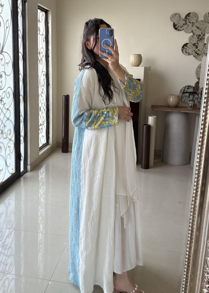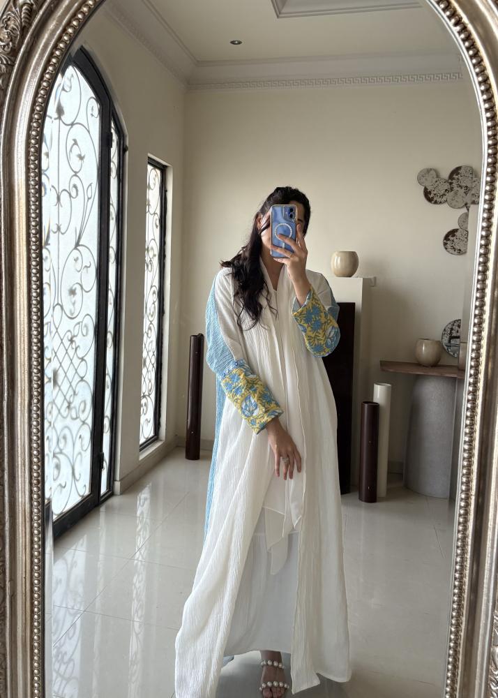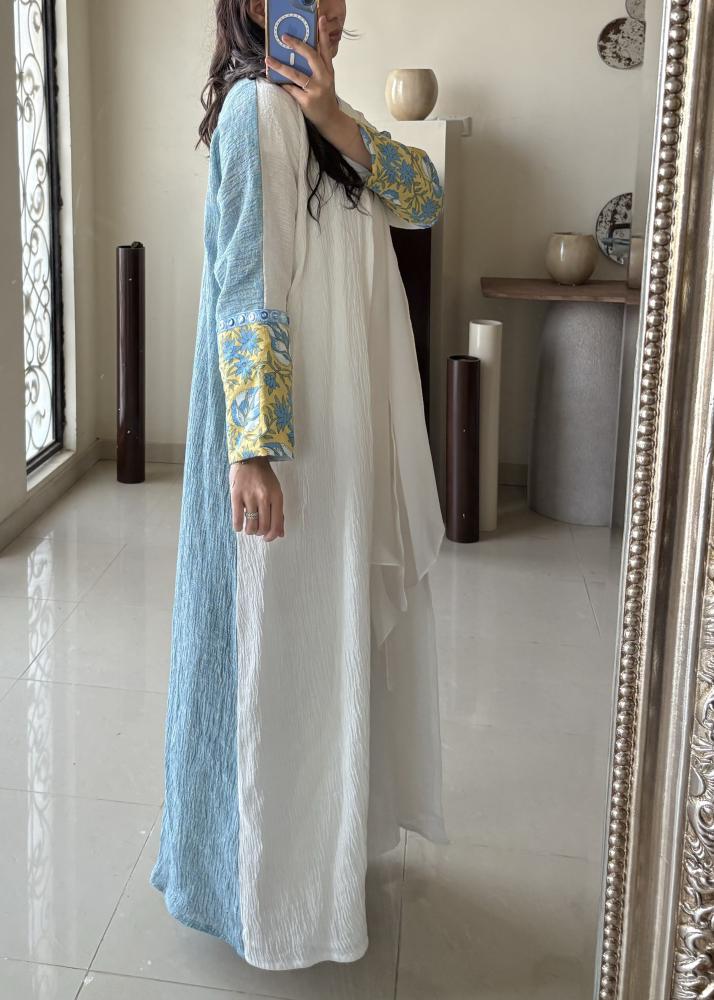 القماش الأمامي أبيض نقي يضفي إشراقة، بينما الخلف لينن أزرق طبيعي يمنحها عمق وأناقة عصرية.