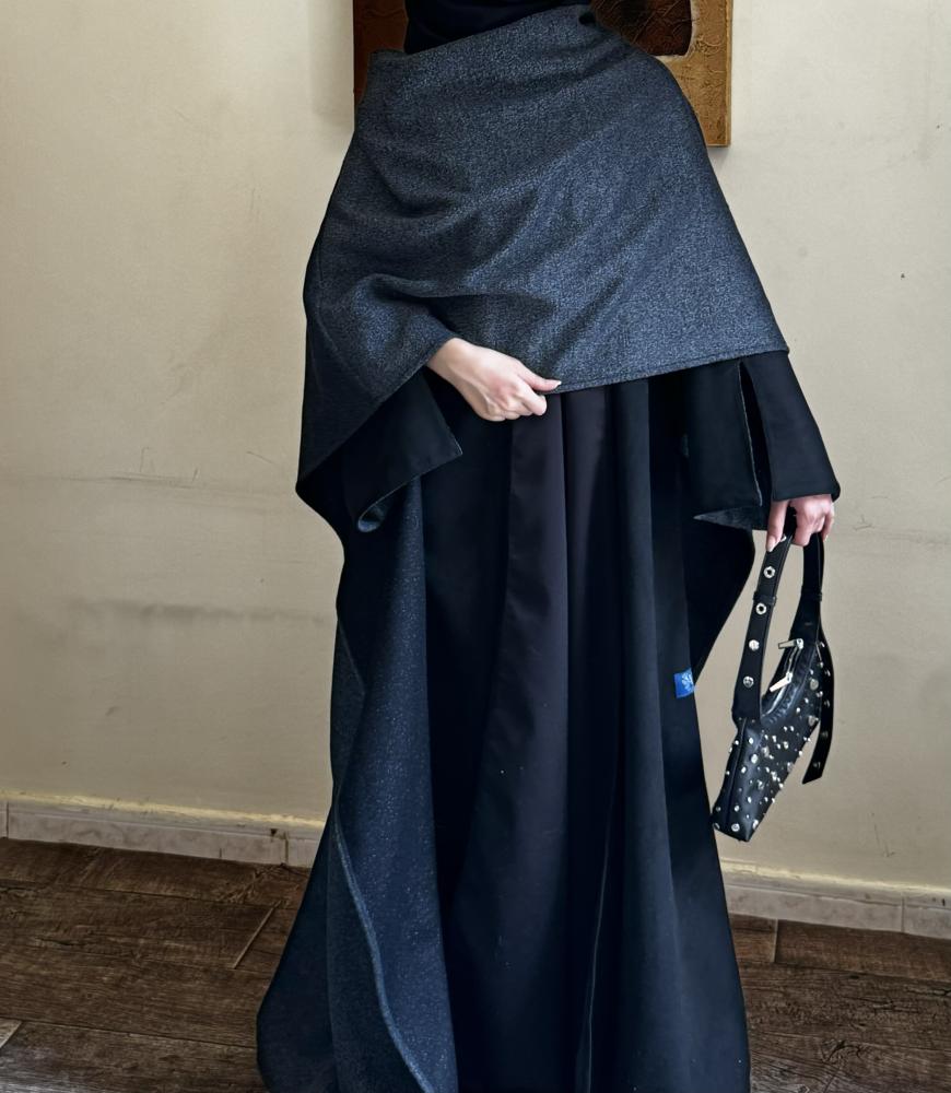 تفاصيل العباية:القماش : شمواه اسود - الشال جوخ استريش ( ناعم) مثبت على الكتف قصة : نص كلوش الطرحة : اسود سادة