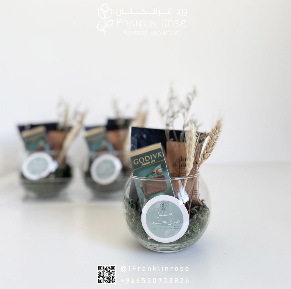 ٣٣فازة زجاجية تحتوي على ظرف قهوة سوداء من عنوان القهوة بالاضافه الى شوكلاتة بلجيكي من Godiva 🍫