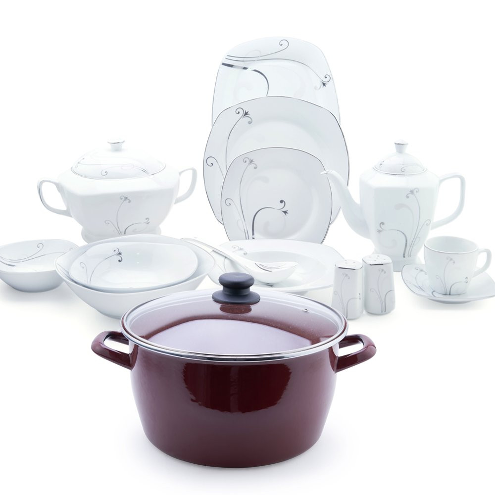 يتكون من:1-طقم عشاء فاخر 53 قطعةطقم سفرة بورسلان مكون من 53 قطعة مصنوع من البورسلان متانة مثالية مقاوم للتجمد يتكون من:6 اطباق مسطحة،8 انش - 6 قطع صحون شوربة،8.5انش- 6 قطع اطباق عشاء مربعة 10.50 انش -6قطع اوعية سلطه 7 انش - 6قطع وعاء 6 انش طقم اكواب مع الصحن 6 حبة للكل -1قطعه سلطانية مع غطاء - 2قطه مملحه - 1 قطعة وعاء سلطة 9 انش - 1 قطعة ملعقة كبيرة - 3 قطعة طبق بيضاوي 14 انش - 1 قطعه براد شاي مع غطاء - 6 قطعة وعاء 6 انش2-قدر TERRACOTTA TOSCANA بغطاء زجاج مقاس 24قدر TERRACOTTA TOSCANA بغطاء زجاج مقاس 24صناعة اسبانيه تتميز بطبقة الجرانيت و بسطح غير لاصق ثنائي الطبقة وبمقابض عازلة للحرارة - إطار من الستانلس استيل المقاوم للصدأ - يوفر 20 %25 من الطاقة - صحي أمن - حاصل على شهادة الجودة . يستخدم على الفرن - النار - المطبخ الكهربائي - موقد السيراميك - غسالة الصحون .قياسات المنتج / الطول والعرض : 24 سم الإرتفاع: 13 سملون المنتج / أحمر