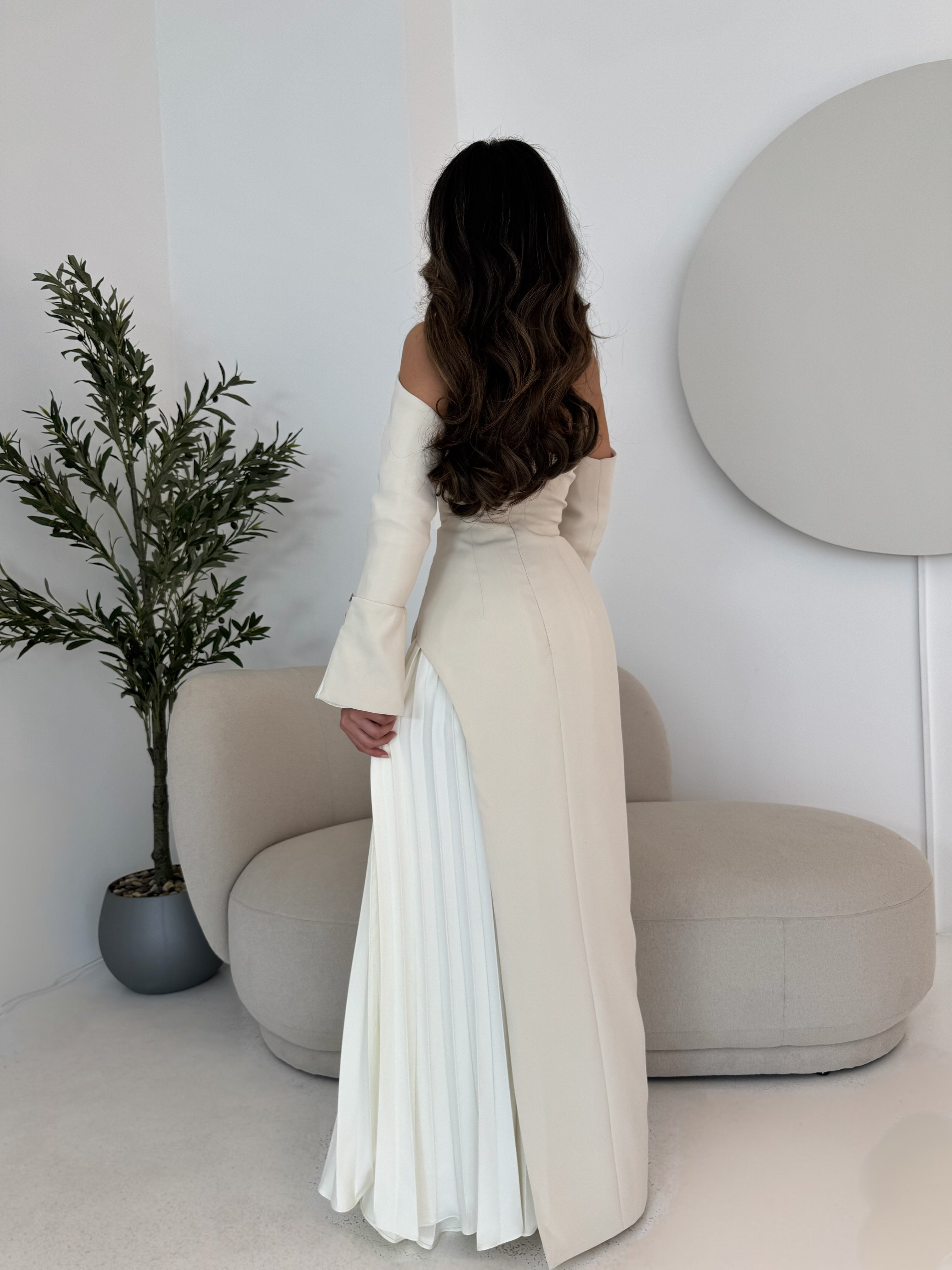 فستان سهرة فاخر بتصميم راقٍ يجمع بين البساطة الراقية واللمسات المعاصرة. يأتي بلون بيج ناعم يمنح إشراقة أنثوية هادئة ومظهرًا راقياً يناسب المناسبات الراقية ,قصة كتف واحد (One Shoulder) ,الأكمام الطويلة تنتهي بـ كشكشة واسعة عند المعصم مع أزرار صغيرة، مما يعطي حركة راقية ولمسة ملكية.